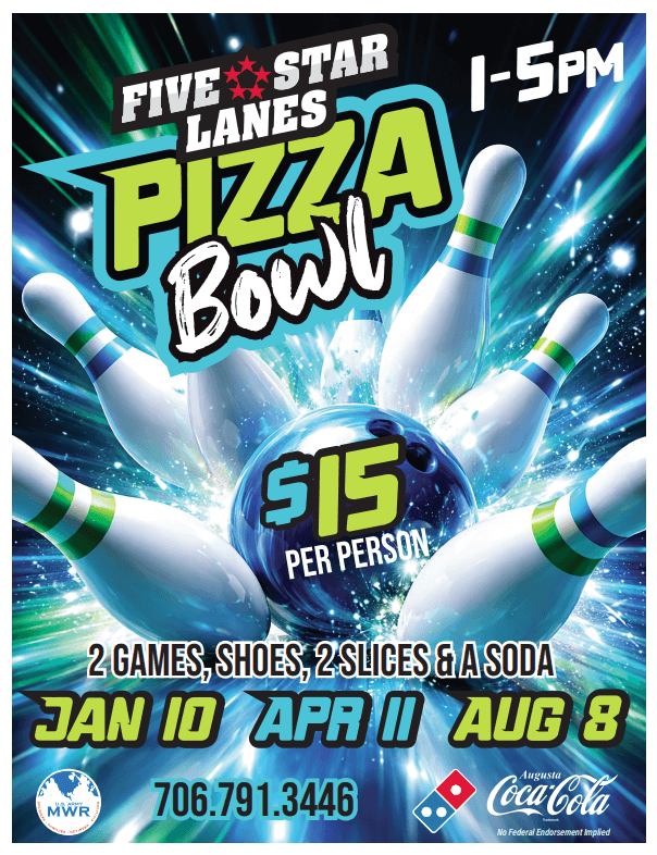Join us for Pizza Bowl, and receive 2 delicious slices of Domino's pizza, an ice‑cold soda from August Coca-Cola, 2 games of bowling, *and* bowling shoes—all for just $15. It’s the perfect combo of strikes, slices, and smiles. Bring your friends, bring your appetite, and let the good times roll! Want to join the fun but don't have gate access? Register for a gate pass at https://pass.aie.army.mil/steps/installation\_selection.