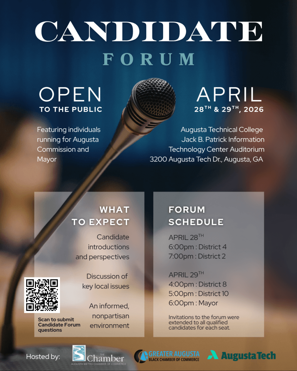 Open to the public, the forum will feature candidates running for Augusta Commission and Mayor. Attendees will have the opportunity to hear directly from candidates as they share their perspectives and engage in discussion around key issues impacting the Augusta community. The event is designed to provide an informed, nonpartisan environment that encourages civic engagement and voter awareness.